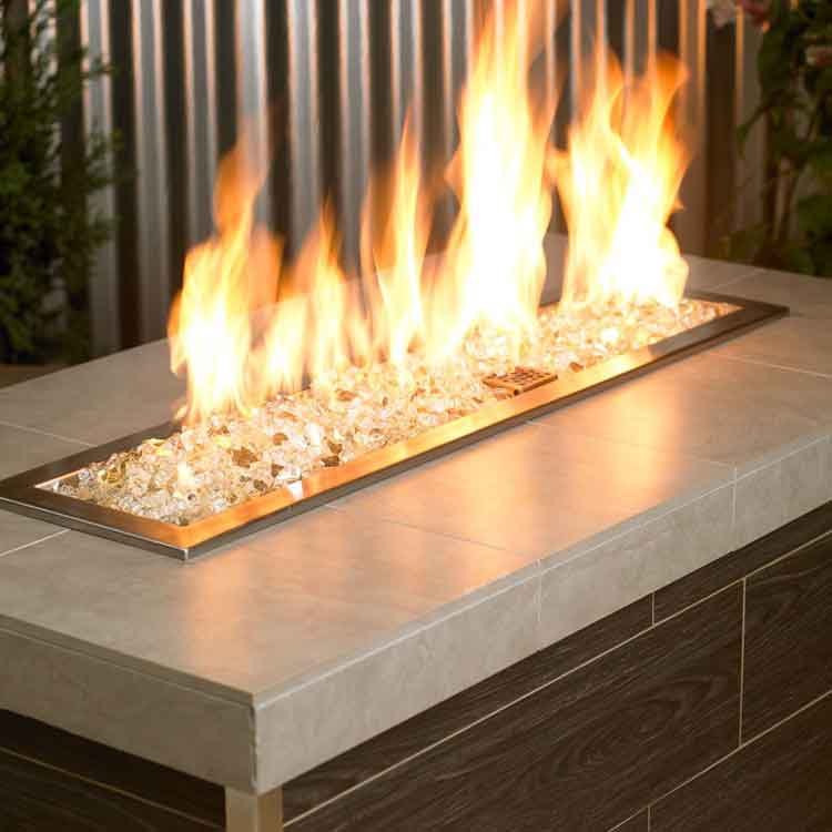 Our 1/2" gold reflective fire glass is not just gorgeous to behold, it is also very practical. It does a great job of completely covering the entire floor of a fire feature, effectively hiding the unseemly pipes and tubes which are often visible in gas fireplaces or fire pits. This makes fire glass a much more preferable alternative to the more common ceramic logs and fire stones.