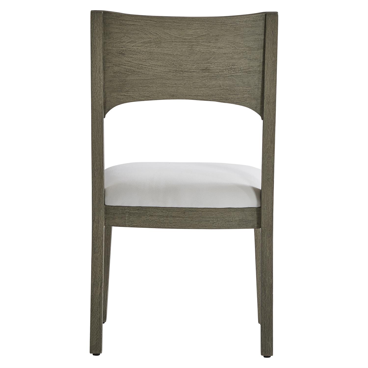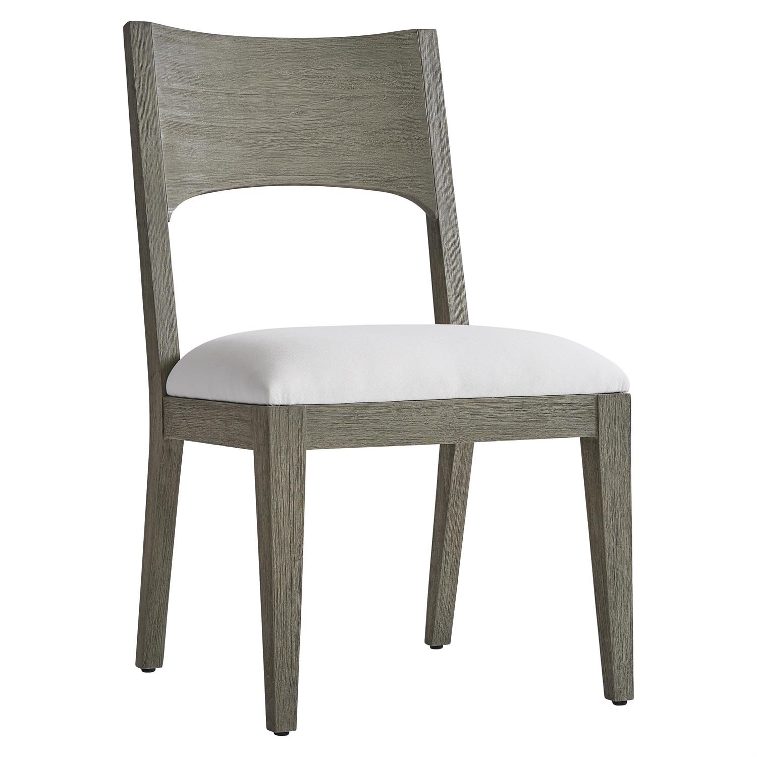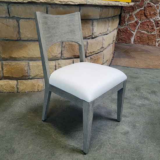 Teak in a Weathered Teak finish is simply shaped for the chic Calais side chair. The front legs take a straight approach, while the back legs slope to the floor, complementing the gently arched back. An upholstered seat ensures that dining al fresco is a comfortable as it is stylish.