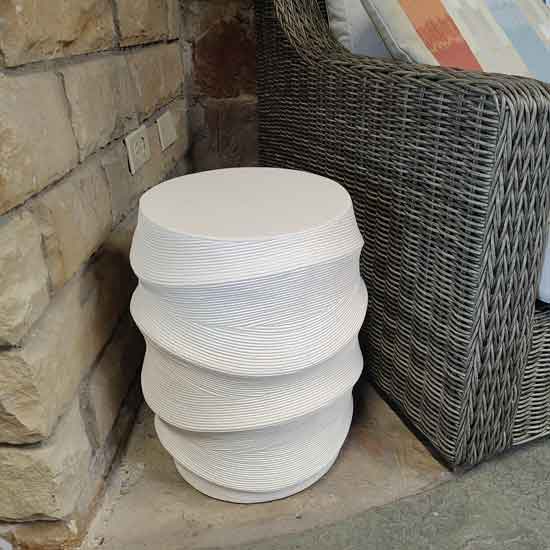Characterized by exceptional luxury and sophisticated design, Bernhardt Exteriors offers a selection of elegant yet durable accent tables. Crafted from natural stonecast in a white finish, the Kai side table offers shape and movement with a coastal vibe. The rattan texture forms an undulating pattern reminiscent of rolling waves. A protective top coat ensures all-weather performance.