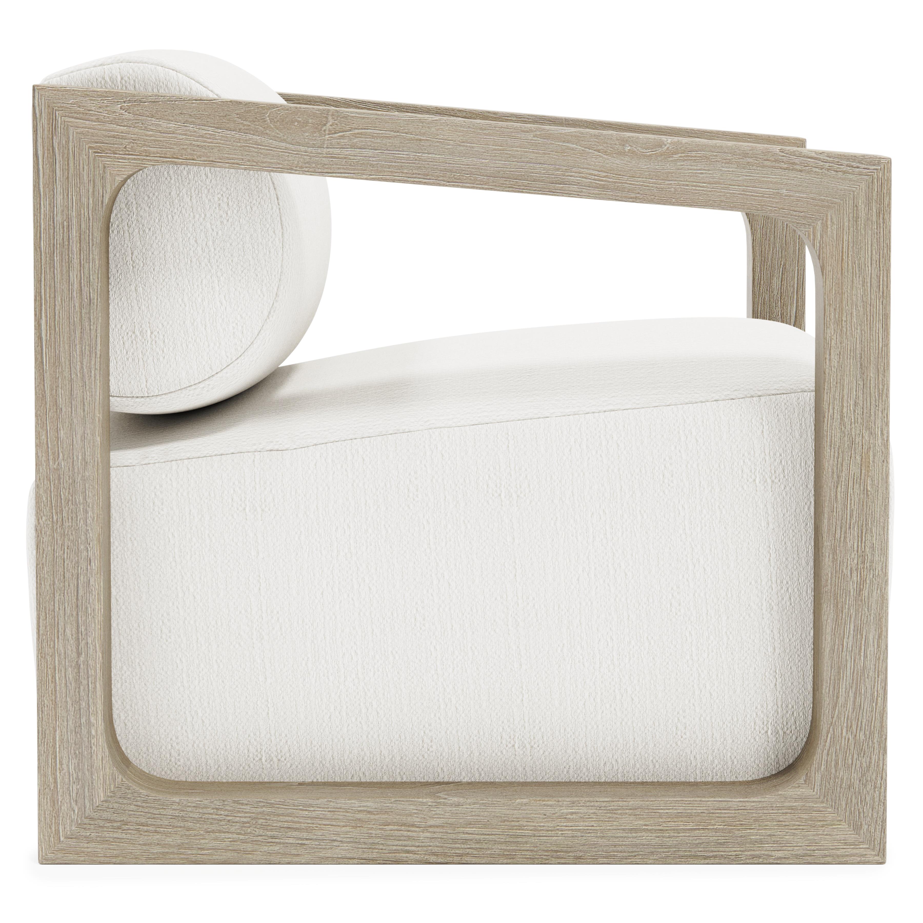 Two exposed teak asymmetrical squares encase the seat and floating back of the Leilani outdoor swivel chair. Offered in Sea Oat finish, the arms provide a gentle slope to the front with softened corners inside the open shape. A rounded back and deeply sloped seat ensure that comfort is key in this 360-degree swivel chair.