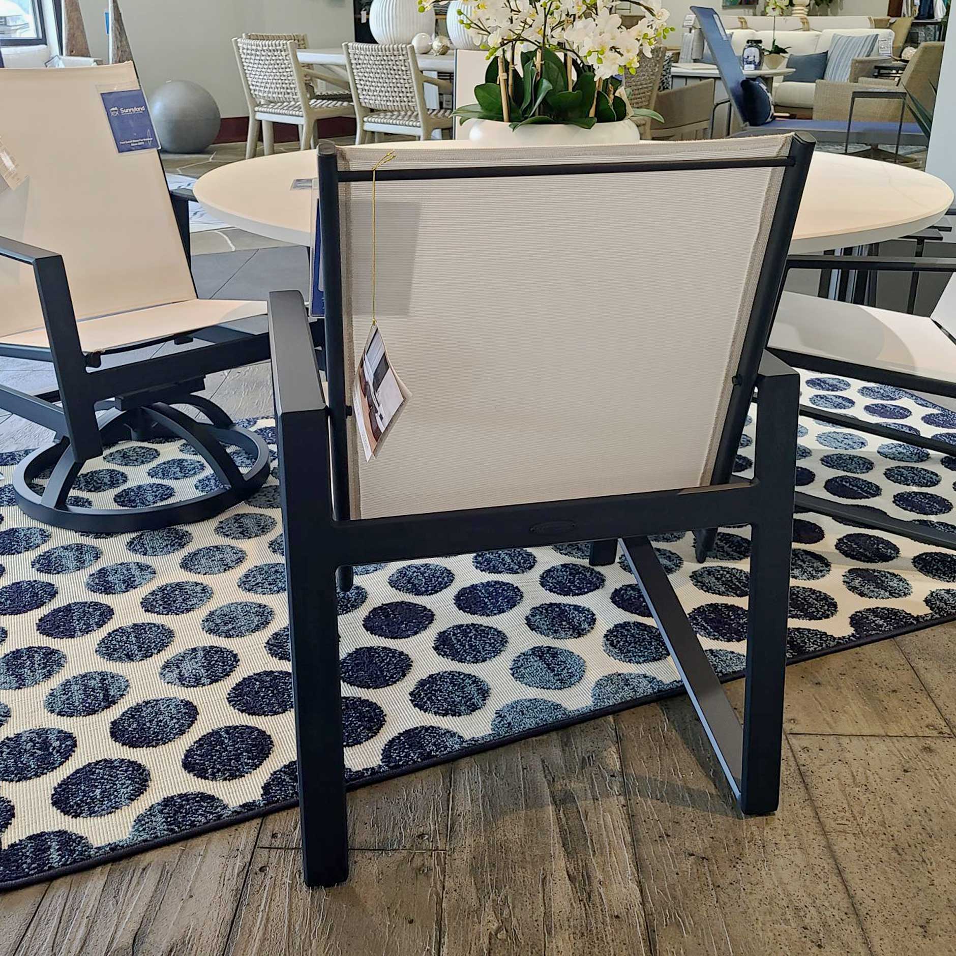 Simple linear arms, legs and back supports complete the Prism Sling Dining Chair designer look. With handcrafted extruded aluminum, a framed upholstered construction and oversized tailored seat and back cushions, the Prism Collection delivers the ultimate in leisure.