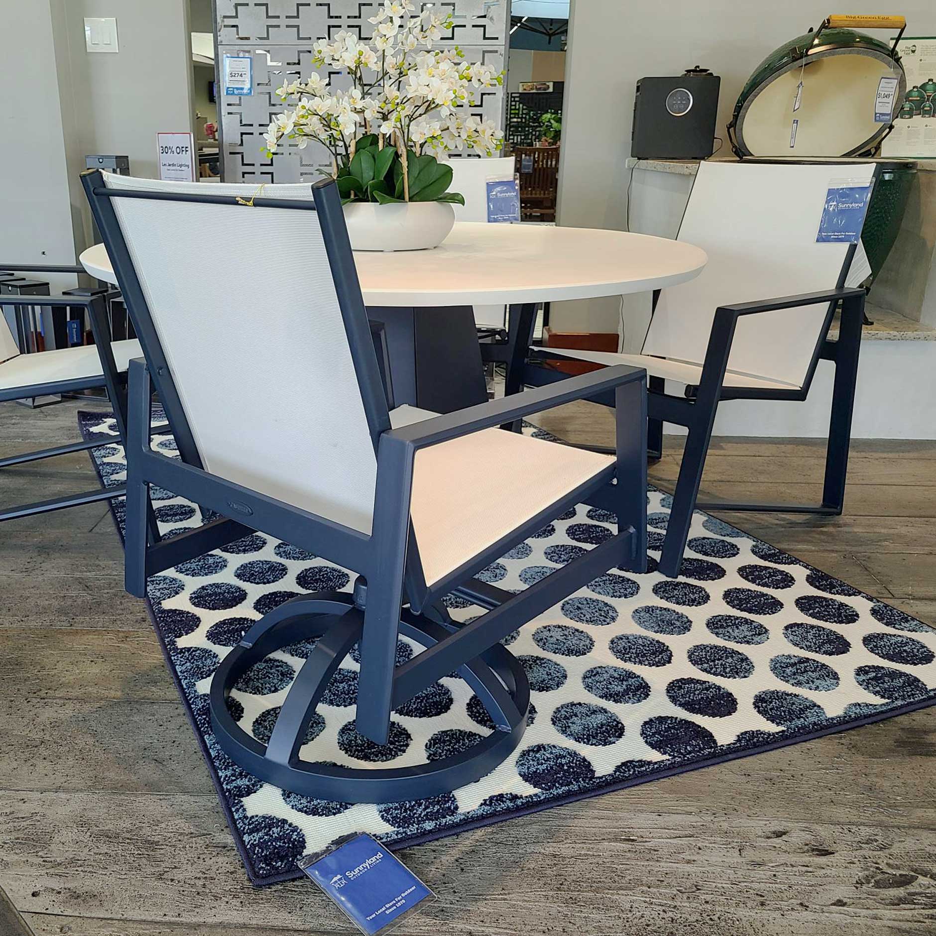 Simple linear arms, legs and back supports complete the Prism Sling Swivel Rocker designer look. With handcrafted extruded aluminum, a framed upholstered construction and oversized tailored seat and back cushions, the Prism Collection delivers the ultimate in leisure.
