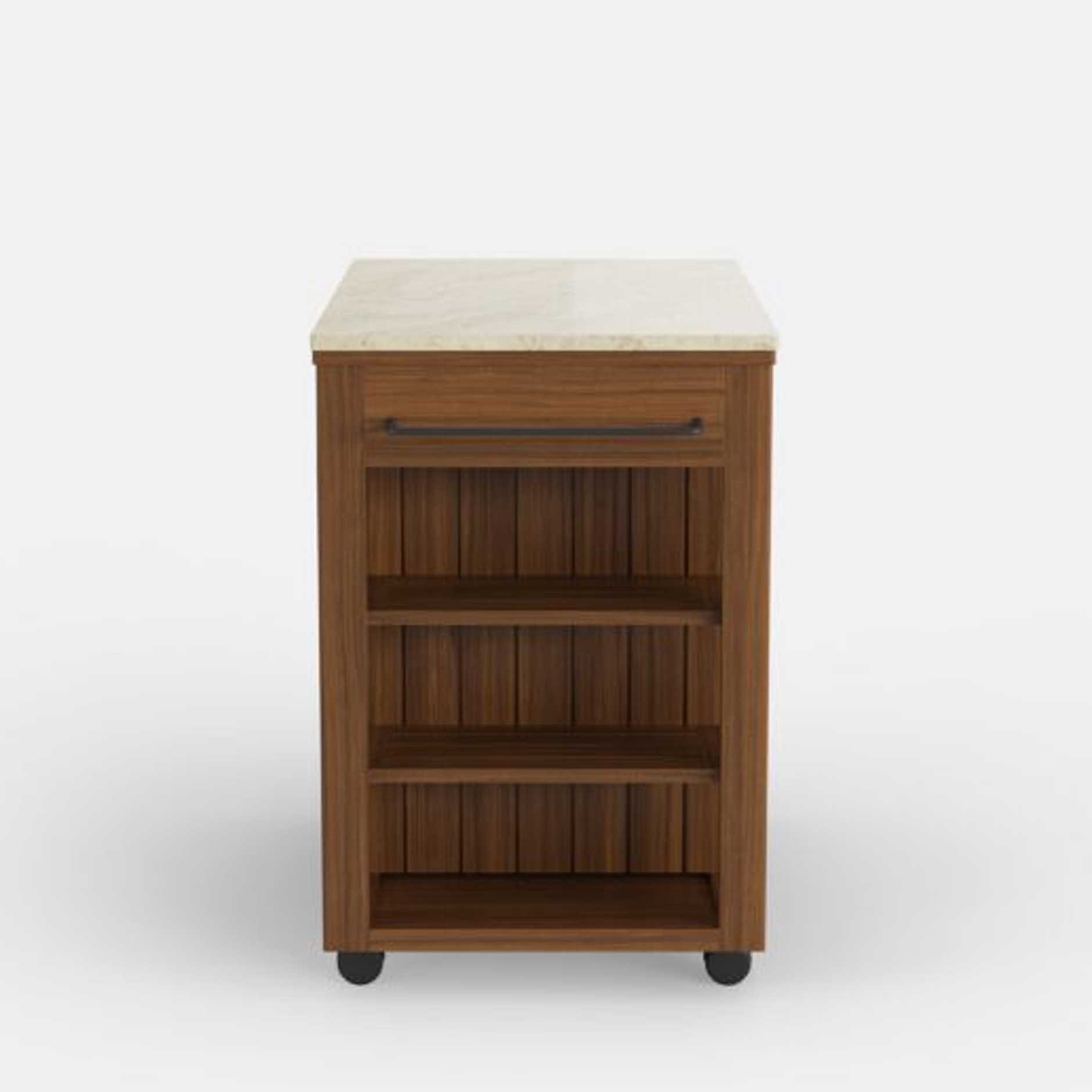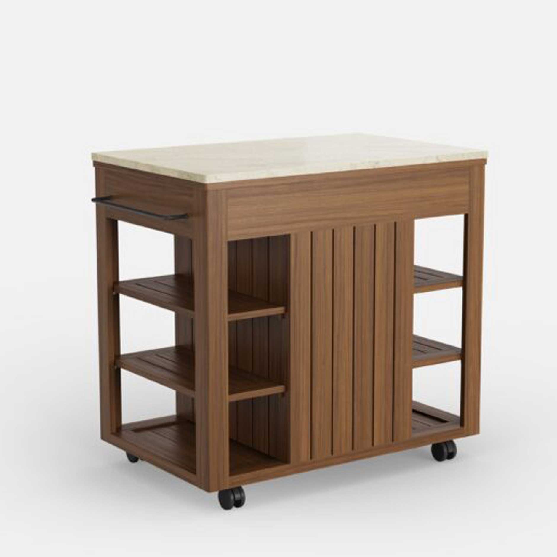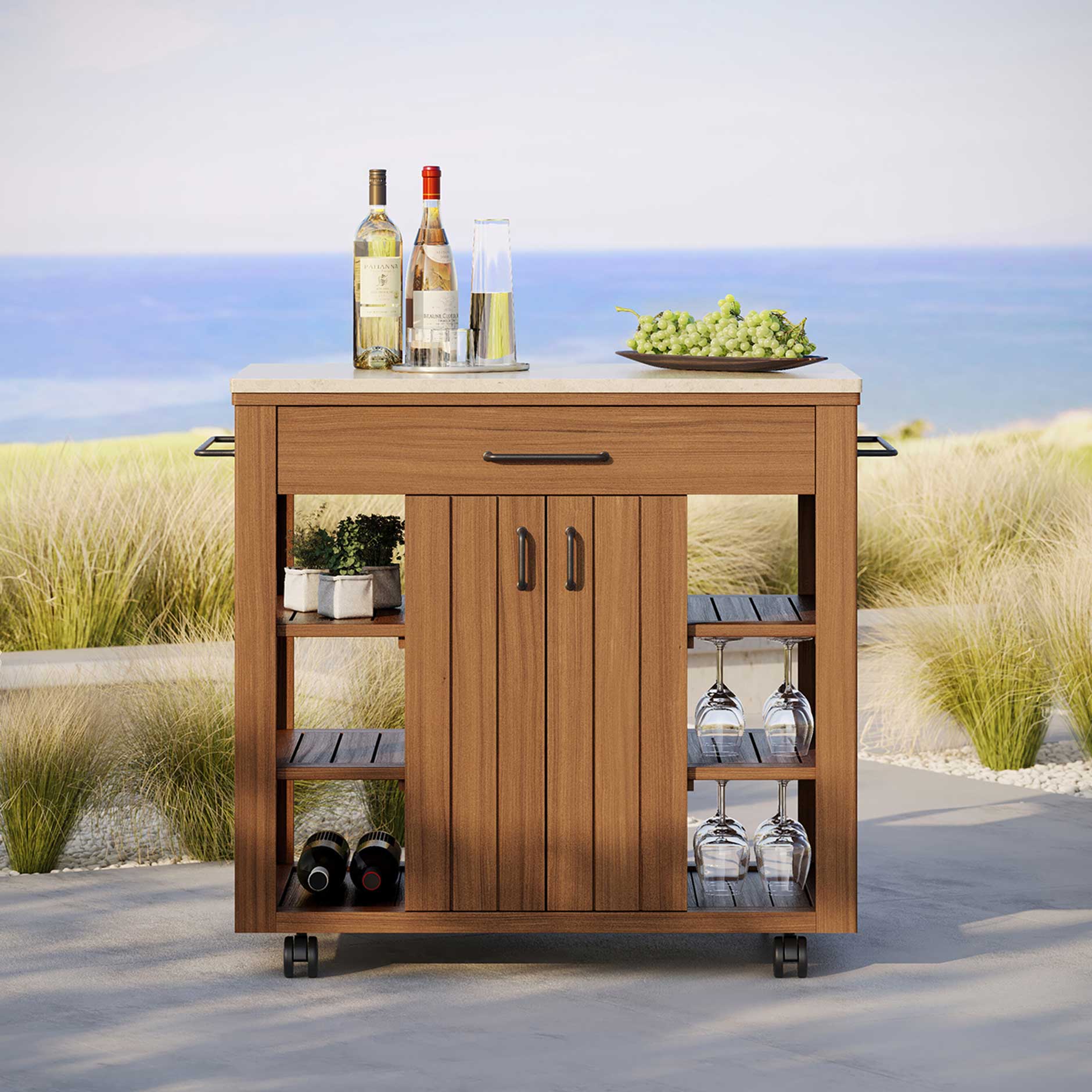 - Topped with a luxurious quartz surface in Shadow or Silica, ideal for prep, plating, and pouring drinks outdoors.