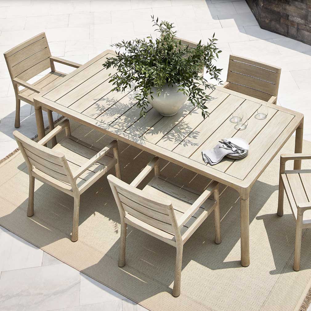The Siesta Key rectangular dining table offers a traditional slatted design that finds a unique definition in the details. The corners are rounded while the legs taper out to the floor. Crafted from carbonized teak in Sea Oat finish, this table is at home outside or inside.