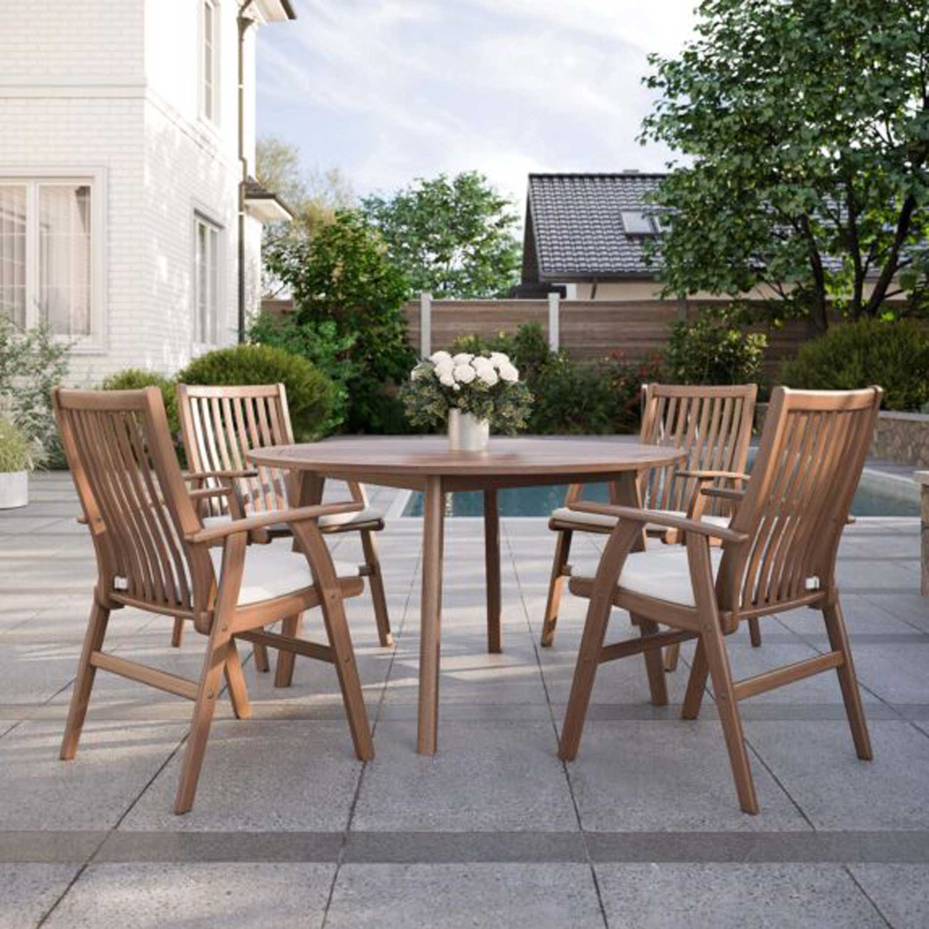 Take meals out of the kitchen and out of the ordinary by serving them up with style at the Foundations 52″ Round Dining Table. Gather four around the table when accompanied by your choice of Ipe dining chairs from Jensen Outdoor. Perfect for everyday meals and dinner parties alike, its European-inspired design is on display in the geometric tabletop pattern and architecturally-angled legs crafted from linear slats of glass-smooth Ipe timber. Alfresco dining becomes a breeze with a precision-cut opening in the center of the tabletop that allows for the passthrough of a tabletop umbrella for all-weather entertaining.