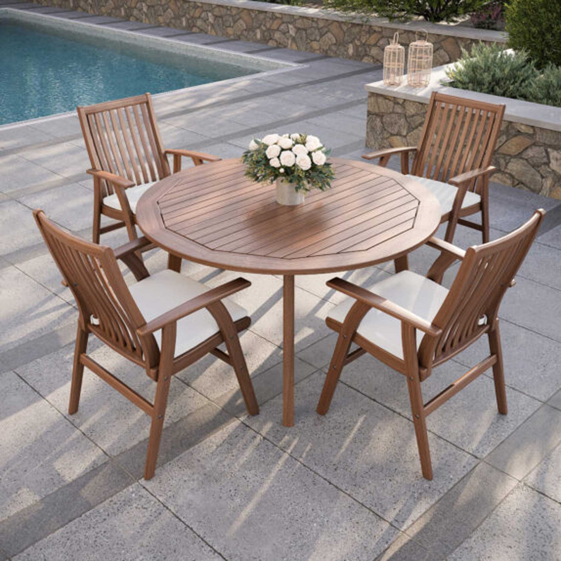 - Round dining table frame is constructed from 100% FSC®-certified Ipe timber harvested sustainably from sustainably managed dry-tropical forests in Boliva.