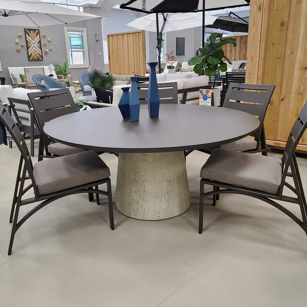 Pompano table bases are available in shell or slate finishes that mimic natural stone. Bellino aluminum tops are finished in rustic Ivory, Concrete or Iron.